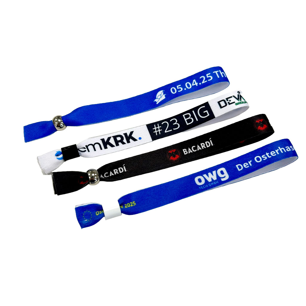 Unlike paper or plastic wristbands, our fabric wristbands are designed for long-term use. Made from high-quality polyester, they are tear-resistant, waterproof and skin-friendly – ideal for multi-day events. Even with active use, they retain their shape and colour – comfortable, secure and durable.